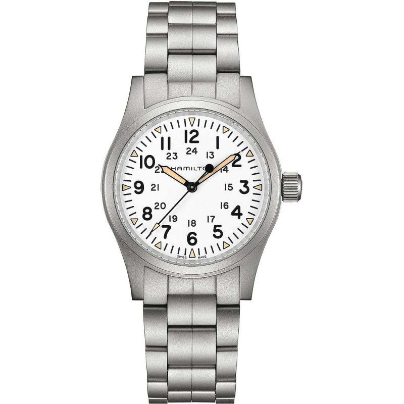 Montre mécanique pour homme Hamilton de la collection kaki field. Montre avec boîtier en acier d'un diamètre de 38 mm. Le cadran à trois aiguilles est blanc avec des index noirs en chiffres arabes. Le bracelet est en acier satiné couleur argent avec boucle déployante. Verre : saphir. Calibre : H- 50 La résistance à l'eau est de 5 ATM. Le mouvement est mécanique avec une réserve de marche de 80 heures. Certificat de fabrication suisse