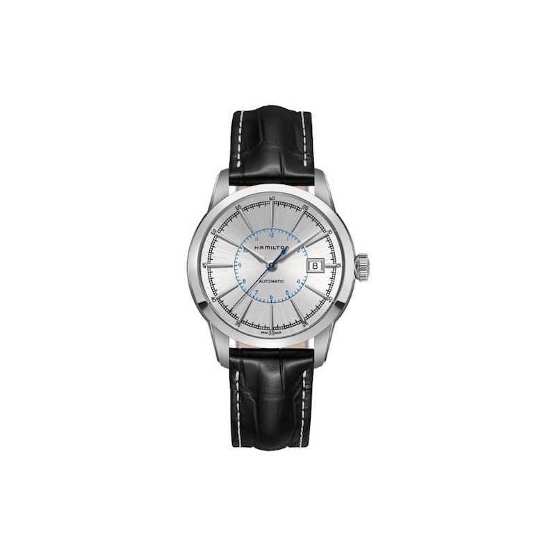 Montre-bracelet pour homme Hamilton avec mouvement automatique calibre H-10 de la collection America Classic, boîtier en acier inoxydable argenté de 40 mm de diamètre et 11,35 mm d'épaisseur, cadran argenté analogique de forme ronde avec index bâtons argentés et détails bleus, scratch -verre saphir résistant, fonction date, bracelet en cuir de veau noir avec boucle déployante, étanchéité 5 ATM, réserve de marche de 80 heures, certificat de fabrication suisse