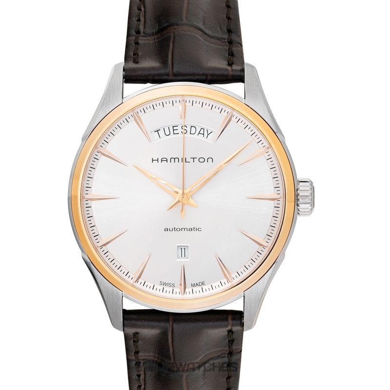 Montre mécanique pour homme Hamilton, collection Jazzmaster, modèle Day Date. Boîtier en acier inoxydable avec revêtement PVD or rose, diamètre 42 mm x 11,80 mm. Cadran analogique rond argenté avec index bâtons or rose, verre saphir inrayable, fonction date. Bracelet en cuir de veau marron avec boucle déployante. Calibre : C07.641. Réserve de marche : 80 heures. Étanchéité : 5 ATM. Mouvement automatique de fabrication suisse.