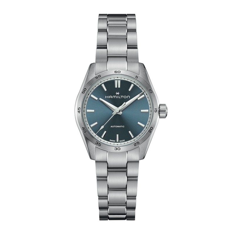 Montre-bracelet Hamilton pour femme, collection Jazzmaster, dotée d'un mouvement automatique suisse calibre H_10, d'une réserve de marche de 80 heures et de l'affichage de l'heure uniquement. Boîtier rond en acier inoxydable de 34 mm de diamètre et 11,8 mm d'épaisseur, lunette en acier argenté avec minuterie et couronne vissée. Cadran analogique bleu avec index bâtons, logo en haut, verre saphir. Bracelet en acier inoxydable argenté avec boucle déployante à bouton-poussoir, étanche à 10 ATM.