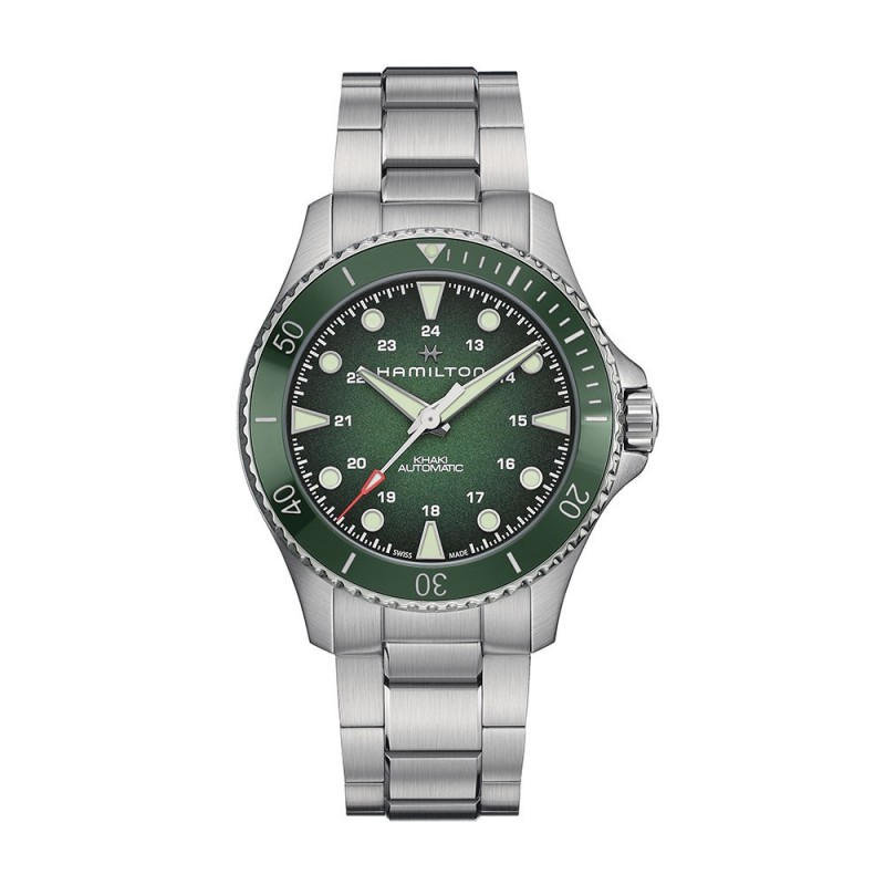 Montre-bracelet Hamilton pour homme, collection Khaki Navy, mouvement automatique H-10 offrant une réserve de marche de 80 heures et l'affichage de l'heure uniquement. Boîtier rond en acier inoxydable argenté de 43 mm de diamètre et 12,58 mm d'épaisseur, lunette en céramique émaillée verte avec minuterie, couronne vissée. Cadran analogique vert dégradé avec index géométriques, logo en haut, verre saphir. Bracelet en acier inoxydable argenté avec boucle déployante à bouton-poussoir, étanche à 30 ATM.