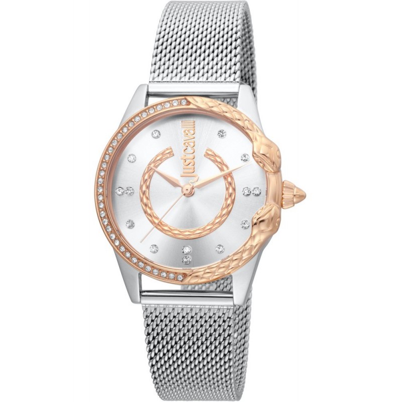 Montre-bracelet Just Cavalli pour femme, issue de la collection Animalier, à mouvement quartz et affichage de l'heure uniquement. Boîtier rond en acier inoxydable argenté de 32 mm de diamètre et 10 mm d'épaisseur, lunette en acier doré rose ornée d'un demi-cercle de zirconiums blancs et de têtes de serpent entrelacées. Cadran analogique argenté avec index en pierre, logo vertical doré rose en haut, verre minéral. Bracelet en maille milanaise en acier inoxydable argenté avec boucle déployante coulissante, étanchéité 5 ATM : résistante aux éclaboussures mais non étanche à la pression.