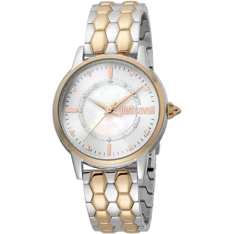 Montre-bracelet Just Cavalli pour femme, issue de la collection Set Emozioni, à mouvement quartz et affichage de l'heure uniquement. Boîtier rond en acier inoxydable argenté, 34 mm de diamètre et 7 mm d'épaisseur. Cadran analogique en nacre avec index bâtons et orné de zirconiums blancs, logo horizontal doré rose à 3 heures, verre minéral résistant aux rayures. Bracelet bicolore en acier inoxydable argenté et doré rose avec boucle déployante à bouton-poussoir. Étanche à 3 ATM : résiste aux éclaboussures, mais n'est pas étanche à la pression.