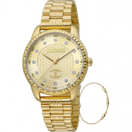 Montre-bracelet Just Cavalli pour femme, issue de la collection Emozioni, à mouvement quartz et affichage de l'heure uniquement. Boîtier rond en acier inoxydable doré de 34 mm de diamètre et 7 mm d'épaisseur, avec lunette moletée en acier doré. Cadran analogique doré orné d'index en pierres précieuses, logo horizontal doré en haut du cadran et verre minéral résistant aux rayures. Bracelet en acier inoxydable avec traitement IP doré et boucle déployante à bouton-poussoir. Étanche jusqu'à 5 ATM : résiste aux éclaboussures, mais n'est pas conçue pour la pression des éclaboussures.