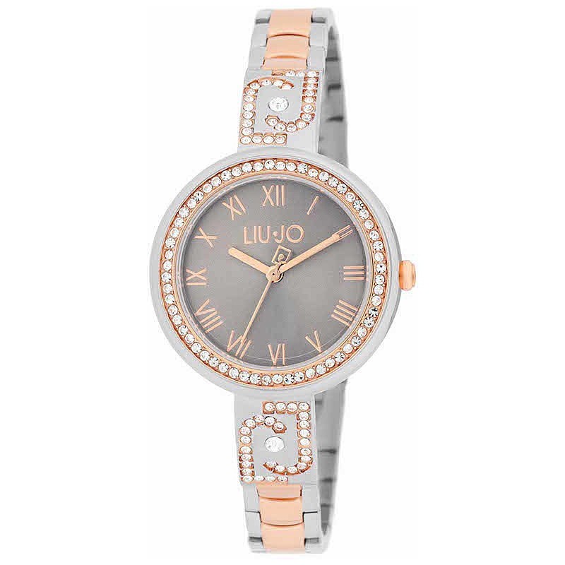 Montre heure seulement Liu Jo Nouvelle grise et rose pour femme TLJ1915 en acier. Montre avec boîtier rond en acier d'un diamètre de 32 mm. Lunette en acier inoxydable poli de couleur or rose ornée de cristaux. Cadran avec verre minéral gris. Mouvement quartz seul le temps. Bracelet bicolore argent et acier rosé avec boucle déployante. Résistance à l'eau 3 ATM
