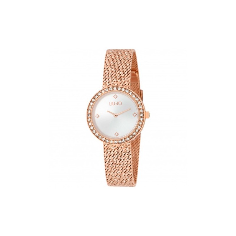 Montre-bracelet pour femme Lady Liu-Jo time only de la collection Lightness avec mouvement à quartz Seiko Cal. VX10. Boîtier rond en acier inoxydable pvd or rose d'un diamètre de 29 mm, lunette ornée de cristaux, fond en acier à pression. Cadran analogique argent avec cristaux blancs aux index, verre minéral. Bracelet en maille d'acier milanais hypoallergénique effet diamant or rose avec fermoir réglable et cran de sécurité. Résistant à l'eau 3 ATM : résiste aux éclaboussures d'eau mais pas à la pression.