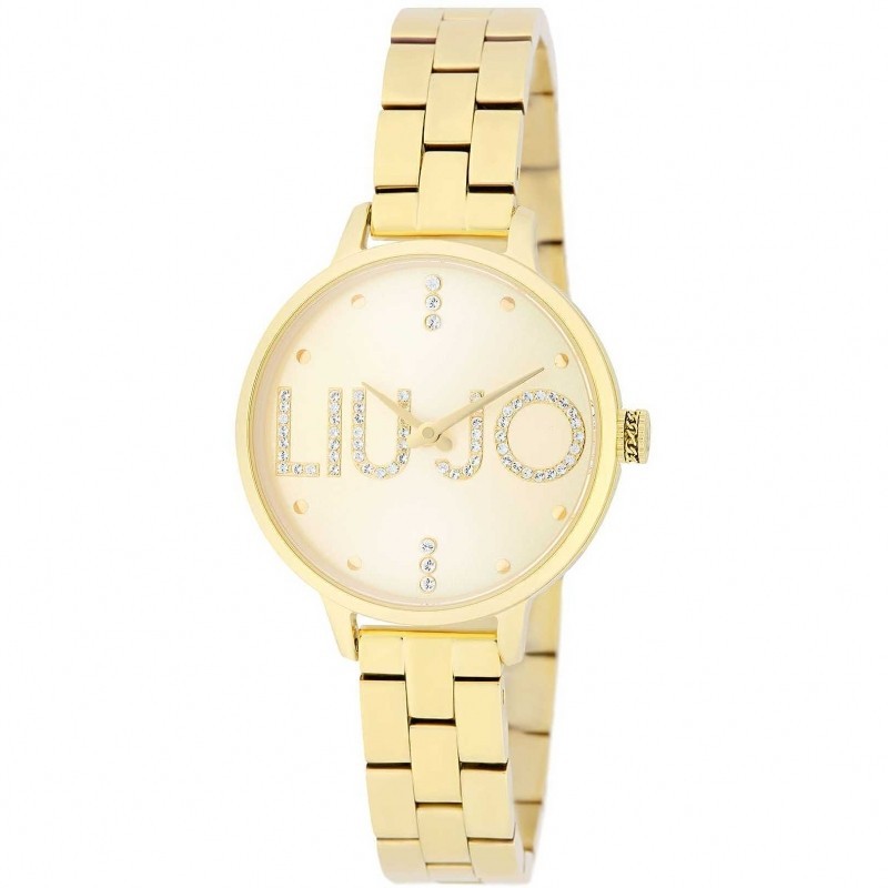 Montre-bracelet pour femme Liu Jo de la collection Couple Plus avec mouvement à quartz Miyota 2025 et fonctions temporelles uniquement. Boîtier en acier inoxydable de 32 mm de diamètre avec traitement IP or, cadran analogique champagne avec logo central en cristaux blancs, index en pierre, verre minéral. Bracelet en acier inoxydable IP or avec boucle déployante. Résistant à l'eau 3 ATM : résiste aux éclaboussures d'eau mais pas à la pression.