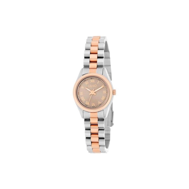 Montre-bracelet pour femme Liu Jo de la collection Aimable avec mouvement à quartz Miyota VJ20 et fonctions horaires uniquement. Boîtier en acier inoxydable bicolore argent et or rose de 26 mm de diamètre, cadran analogique gris tourterelle avec index en chiffres romains, verre minéral. Bracelet en acier inoxydable bicolore argent et or rose avec une boucle déployante. 5 ATM résistant à l'eau
