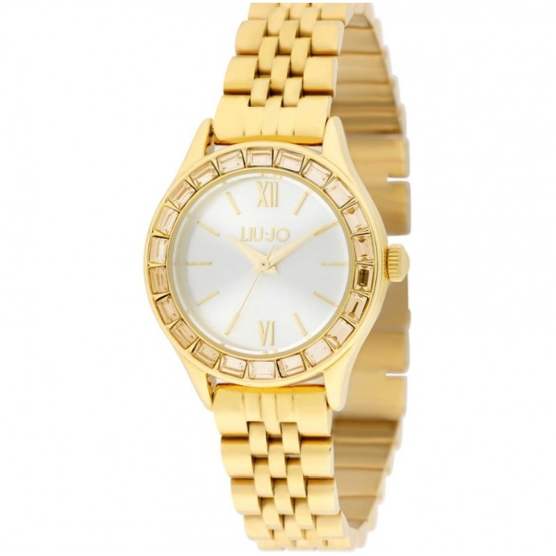 Montre-bracelet pour femme Liu Jo de la collection Casual Season avec mouvement à quartz et fonction heure seulement. Boîtier en acier inoxydable couleur or de 30 mm de diamètre, la lunette est ornée de cristaux jaunes taille baguette, cadran analogique couleur argent avec index bâtons mixtes et chiffres romains uniquement à 12h et 6h, verre minéral. Bracelet en acier inoxydable doré avec boucle déployante, étanchéité 3 ATM : résiste aux éclaboussures d'eau mais pas à la pression.