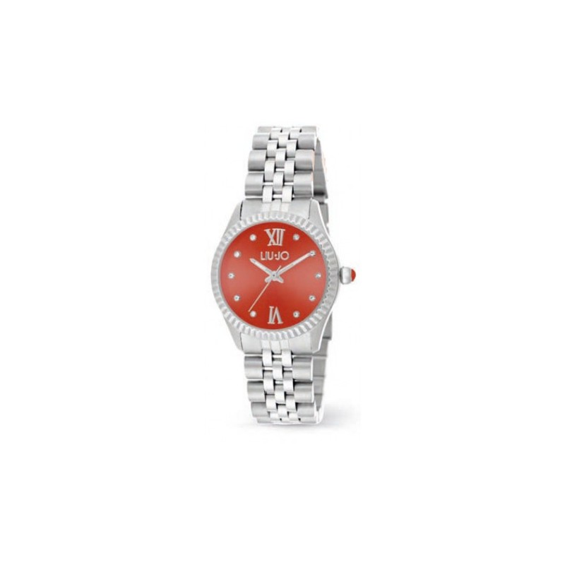Montre-bracelet pour femme Liu Jo de la collection Tiny avec mouvement à quartz Miyota et fonction horaire uniquement. Boîtier en acier inoxydable argenté d'un diamètre de 30 mm, lunette moletée en acier argenté, cadran analogique rouge à fond en acier verrouillé par pression avec index mixtes avec pierres et chiffres romains uniquement à 12h et 6h, verre minéral. Bracelet en acier inoxydable argenté avec boucle déployante, étanchéité 5 ATM : résiste aux éclaboussures d'eau mais pas à la pression.