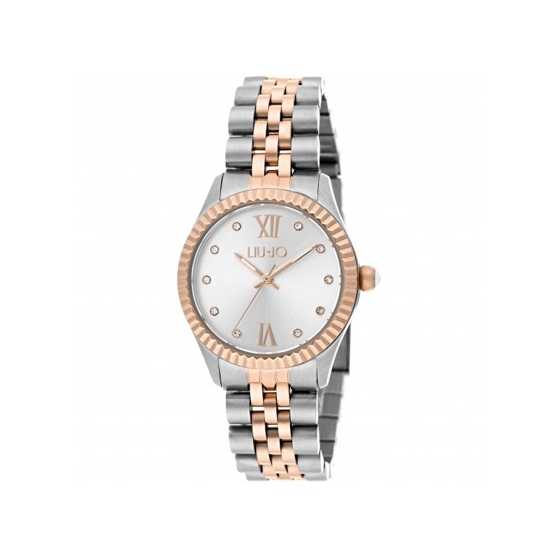 Montre-bracelet pour femme Liu Jo de la collection Tiny avec mouvement à quartz Miyota avec fonction horaire uniquement. Boîtier de 30 mm de diamètre en acier inoxydable argenté et doré rose, lunette cannelée dorée rose, cadran analogique argenté avec cristaux blancs aux index et chiffres romains aux positions 12 et 6 heures et logo sur le dessus, verre minéral. Bracelet en acier inoxydable bicolore argent et or rose avec boucle déployante, étanche 5 ATM : résiste aux éclaboussures d'eau mais pas à la pression.