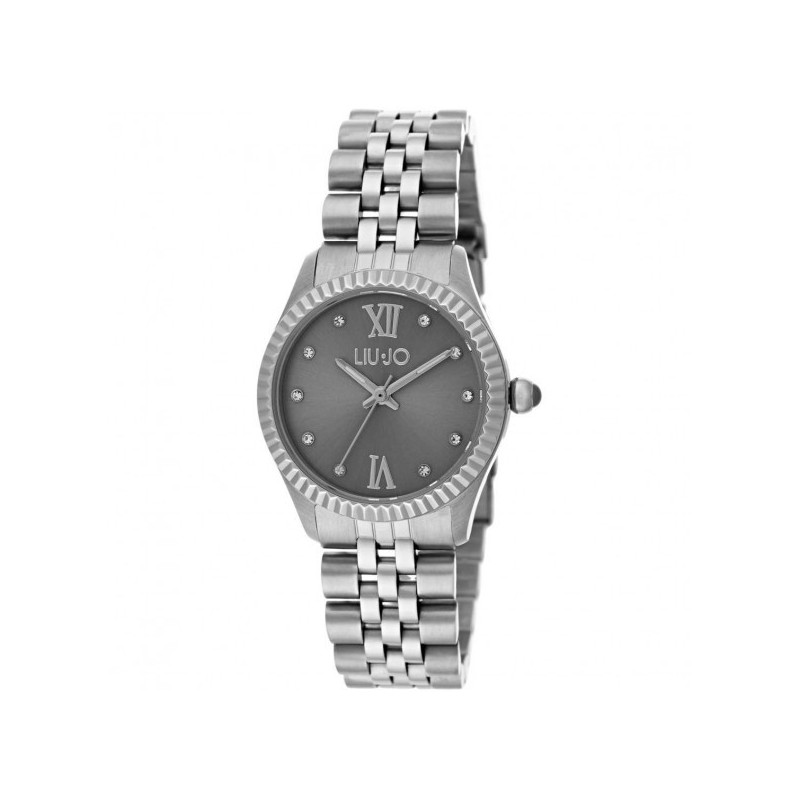 Montre-bracelet pour femme Liu Jo de la collection Tiny avec mouvement à quartz Miyota et fonction horaire uniquement. Boîtier en acier inoxydable argenté de 30 mm de diamètre, lunette argentée cannelée, cadran analogique gris avec cristaux blancs aux index et chiffres romains aux positions 12 et 6 heures et logo en haut, verre minéral. Bracelet en acier inoxydable argenté avec boucle déployante, anti-éclaboussures 5 ATM : anti-éclaboussures mais pas sous pression.