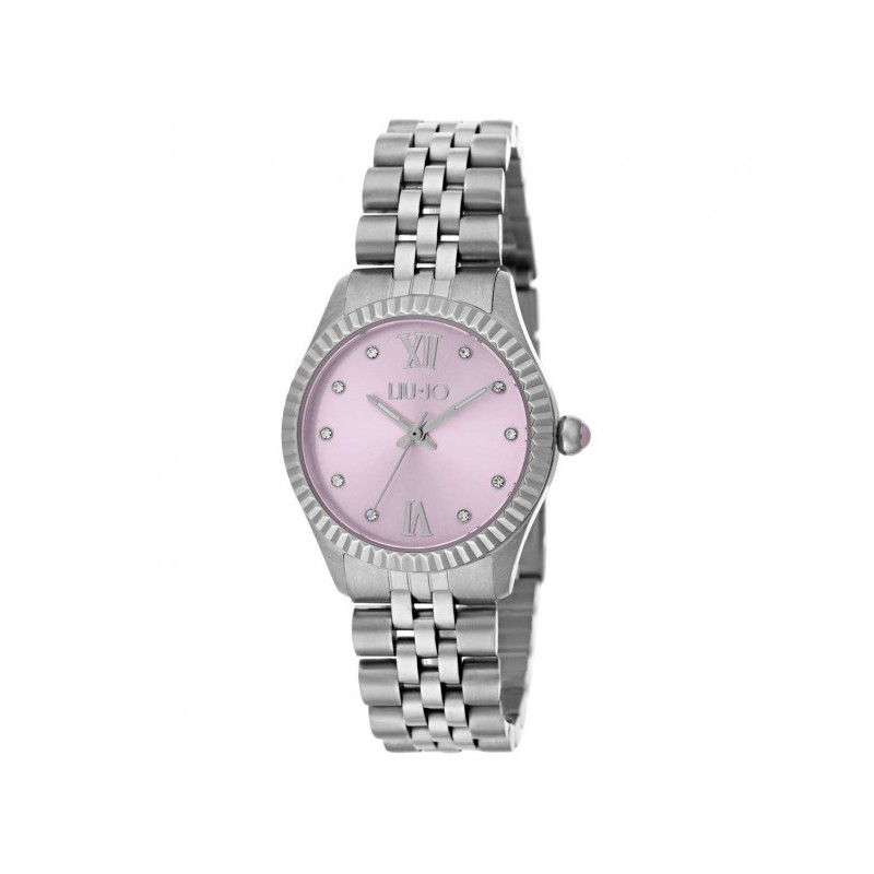 Montre-bracelet pour femme Liu jo de la collection Tiny avec mouvement à quartz Miyota et fonction horaire uniquement. Boîtier en acier inoxydable argenté de 30 mm de diamètre, lunette argentée cannelée, cadran analogique rose avec cristaux blancs aux index et chiffres romains aux positions 12 et 6 heures et logo en haut, verre minéral. Bracelet en acier inoxydable couleur argent avec boucle déployante, étanche 5 ATM : résistant aux éclaboussures d'eau mais pas à la pression