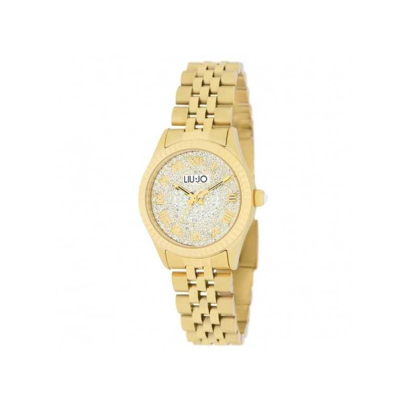 Montre-bracelet pour femme Liu Jo de la collection Tiny Full Pave' avec mouvement à quartz Miyota 2035 et fonctions horaires uniquement. Boîtier en acier inoxydable doré de 30 mm de diamètre, cadran analogique entièrement recouvert de cristaux blancs, index chiffres romains et logo sur le dessus, verre minéral. Bracelet en acier inoxydable doré avec boucle déployante, étanche 5 ATM : résistant aux éclaboussures d'eau mais pas à la pression.