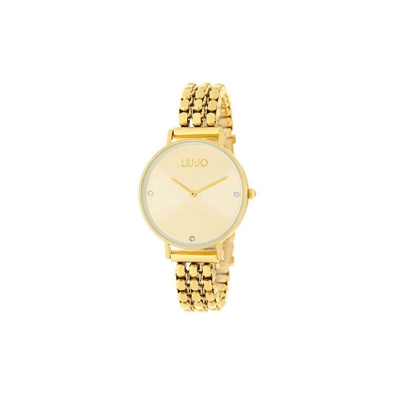 Montre-bracelet pour femme Liu Jo de la collection Framework avec mouvement à quartz et fonction heure seule. Boîtier en acier inoxydable couleur or d'un diamètre de 32 mm et d'une épaisseur de 7 mm, fond et couronne à encliquetage, cadran analogique couleur or jaune avec cristaux aux index, verre minéral. Bracelet en acier inoxydable maille dorée avec boucle déployante, étanche 3 ATM : résiste aux éclaboussures d'eau mais pas à la pression.