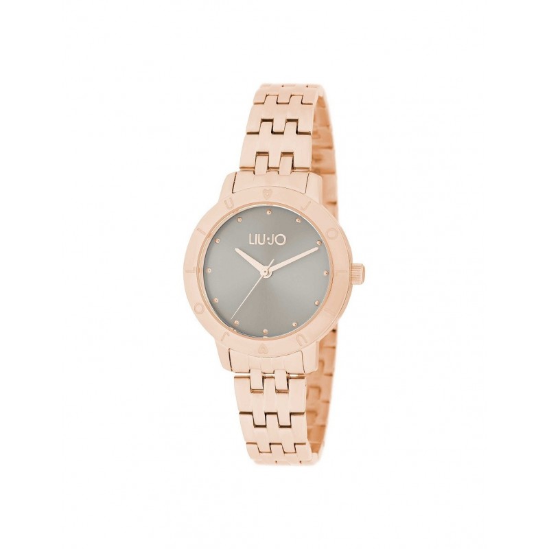 Montre-bracelet pour femme Liujo de la collection Greta avec mouvement à quartz Miyota cal. 2035. et fonction horaire uniquement. Boîtier en acier inoxydable doré rose de 32 mm de diamètre, cadran analogique gris avec index géométriques doré rose, verre minéral. Bracelet en acier inoxydable couleur or rose avec boucle déployante, étanche 3 ATM : résiste aux éclaboussures d'eau mais pas à la pression.