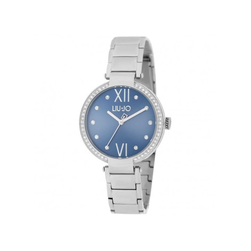 Montre-bracelet pour femme Liu Jo de la collection Divine avec mouvement à quartz Miyota 2035 et fonctions horaires uniquement. Boîtier en acier inoxydable argenté de 34 mm de diamètre, lunette ornée de cristaux blancs, cadran analogique bleu avec zircons aux index et chiffres romains à 12 et 6, verre minéral. Bracelet en acier inoxydable argenté avec boucle déployante, étanche 5 ATM : résiste aux éclaboussures d'eau mais pas à la pression.