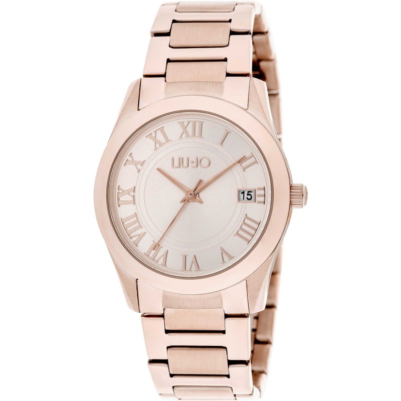 Montre-bracelet pour femme Liu Jo de la collection Romana avec mouvement à quartz à trois aiguilles et fonction heure uniquement avec affichage de la date. Boîtier de forme ronde en acier inoxydable avec traitement IP or rose, diamètre 36 mm, fond et couronne ajustés par pression, cadran analogique couleur or rose avec index chiffres romains, affichage de la date à 3 heures, logo sur le dessus, verre minéral. Bracelet en acier inoxydable avec traitement IP or rose et boucle déployante, étanche 3 ATM : résistant aux projections d'eau mais pas sous pression.