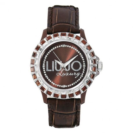 Montre-bracelet pour femme Liu Jo de la collection Time Luxury avec mouvement à quartz Miyota 2035 à trois aiguilles et fonction heure uniquement. Boitier de forme ronde en polycarbonate à double contour de cristaux baguette blancs et marron, de 39 mm de diamètre, cadran analogique marron avec contour de cristaux blancs, sans index, couronne clipsable, fond vissé, logo sur la partie centrale en blanc cristaux, verre minéral. Bracelet en cuir marron avec fermeture à boucle ardillon, étanche 5 ATM : résistant aux projections d'eau mais pas sous pression.