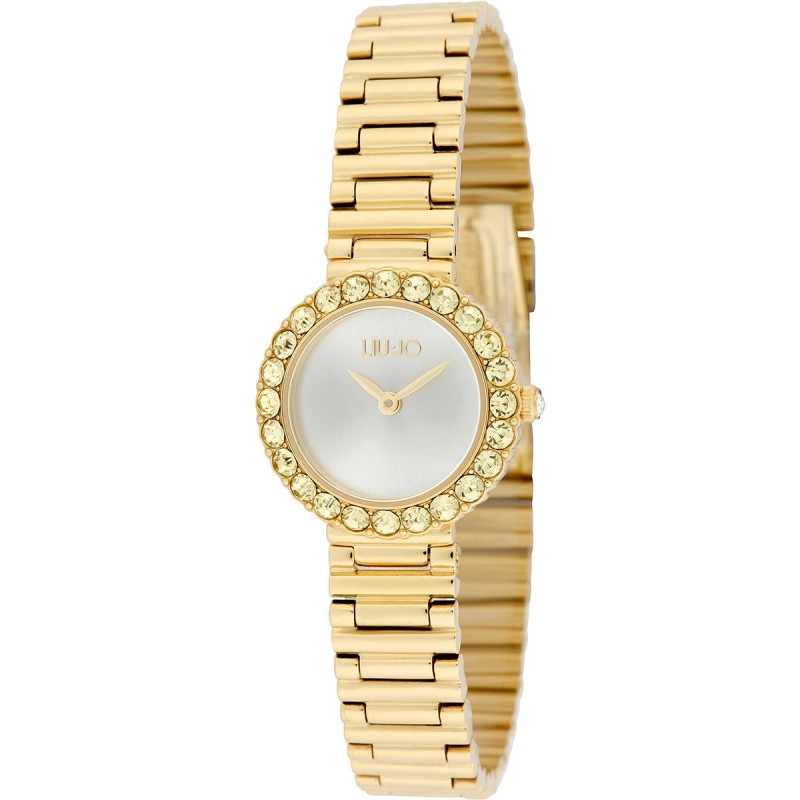 Montre-bracelet pour femme Liu Jo de la collection Posing avec mouvement à quartz Miyota Cal. VJ20 et fonction heure uniquement. Boîtier de forme ronde en acier inoxydable finition dorée, diamètre 25 mm, lunette agrémentée d'un contour en zircon jaune, cadran analogique argenté sans index, logo sur le dessus, verre minéral. Bracelet en acier inoxydable doré avec boucle déployante, étanche 3 ATM : résistant aux projections d'eau mais pas sous pression.