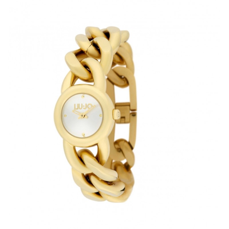 Montre-bracelet pour femme Liu Jo de la collection New Glam avec mouvement à quartz Miyota et fonction heure uniquement. Boîtier rond en acier inoxydable doré d'un diamètre de 25 mm, cadran analogique argenté avec quatre index en pierre, logo sur le dessus, verre minéral. Bracelet en acier inoxydable doré avec maillon de chaîne et boucle déployante, résistant à l'eau 3 ATM : résistant aux éclaboussures mais pas sous pression.