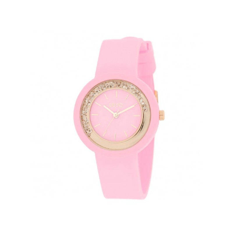Montre-bracelet pour femme Liu Jo de la collection Teen Dancing, dotée d'un mouvement à quartz Seiko PC21J et affichant uniquement l'heure. Boîtier rond en acier inoxydable doré rose, recouvert de silicone rose, 33 mm de diamètre. Cadran analogique rose avec finitions dorées rose et orné de cristaux blancs mobiles qui suivent les mouvements du poignet, index bâtons dorés rose, logo sur le dessus, verre minéral. Bracelet en silicone rose avec boucle ardillon, étanchéité 3 ATM : résistante aux éclaboussures mais non étanche à la pression.