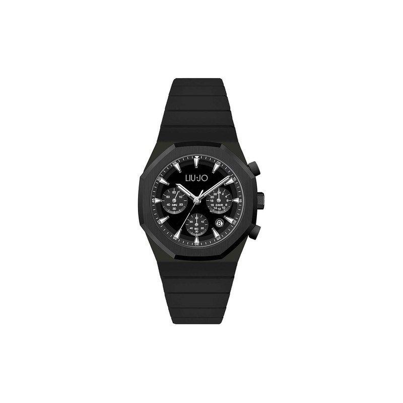 Montre homme Liu Jo de la collection Yacht Chrono, à mouvement quartz et fonction chronographe avec date. Boîtier octogonal en acier inoxydable noir de 42 mm de diamètre. Cadran analogique rond noir avec index bâtons, affichage de la date entre 4 et 5 heures, logo sur le dessus, verre minéral. Bracelet en silicone noir avec boucle ardillon. Étanchéité 3 ATM : résistante aux éclaboussures, mais non étanche à la pression.