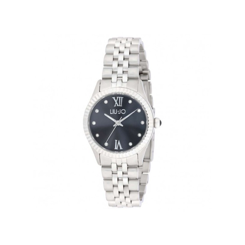Montre-bracelet pour femme Liu Jo de la collection Tiny, dotée d'un mouvement à quartz Miyota Cal. 2035 et d'un affichage de l'heure uniquement. Boîtier rond en acier inoxydable argenté de 30 mm de diamètre. Cadran analogique noir avec index en pierre et chiffres romains à 12 h et 6 h uniquement, logo en haut, verre minéral. Bracelet en acier inoxydable argenté avec boucle déployante à bouton-poussoir, étanchéité 5 ATM : résistante aux éclaboussures mais non étanche à la pression.