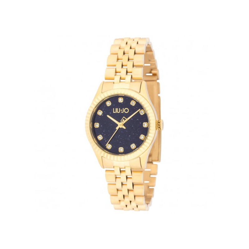 Montre-bracelet pour femme Liu Jo de la collection Tiny, dotée d'un mouvement à quartz Miyota cal. 2036 et d'un affichage de l'heure uniquement. Boîtier rond en acier inoxydable doré de 30 mm de diamètre, lunette moletée en acier doré. Cadran analogique bleu foncé effet granit avec index en cristal, logo en haut, verre minéral. Bracelet en acier inoxydable doré avec boucle déployante à bouton-poussoir. Étanchéité 5 ATM : résistante aux éclaboussures, mais non étanche à la pression.