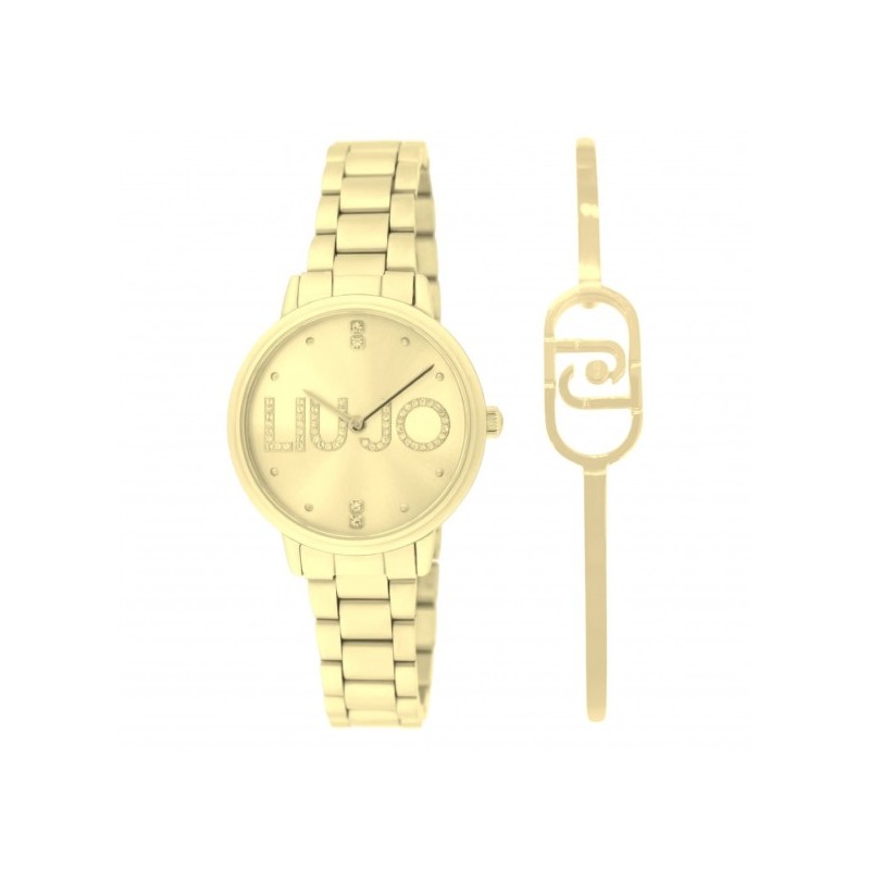 Montre-bracelet pour femme Liu Jo de la collection Identity, dotée d'un mouvement à quartz Seiko VJ20 et affichant uniquement l'heure. Boîtier rond en acier inoxydable doré de 32 mm de diamètre. Cadran analogique doré avec index en cristal, logo en cristal au centre, verre minéral. Bracelet en acier inoxydable doré avec boucle déployante à bouton-poussoir, étanche à 3 ATM : résiste aux éclaboussures, mais pas à la pression. Un bracelet en acier doré avec logo est inclus.