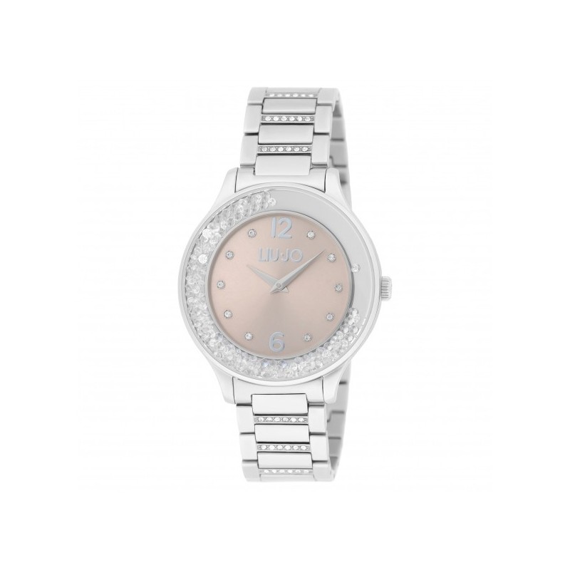 Montre-bracelet pour femme Liu Jo de la collection Identity, dotée d'un mouvement à quartz Miyota GL24 et affichant uniquement l'heure. Boîtier rond en acier inoxydable argenté de 36,5 mm de diamètre, lunette en acier argenté ornée de cristaux blancs mobiles qui suivent les mouvements du poignet, fond clipsé. Cadran analogique rose avec index en pierres précieuses et chiffres arabes à 12 h et 6 h uniquement, logo en haut, verre minéral. Bracelet en acier inoxydable argenté avec boucle magnétique, étanchéité 3 ATM : résistante aux éclaboussures mais non étanche à la pression.
