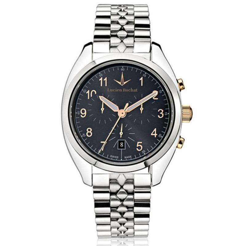 ShippingMontre Chronographe Homme Lucien Rochat de la Collection Lunel. Modèle Avec Boitier En Acier Poli Et Pvd Or Rose De La Taille De 50X41Mm, Et D'une Épaisseur De 9,3 Mm. Horloge avec cadran gris et bracelet en métal couleur acier et verre saphir. Modèle avec verre saphir, résistance à l'eau 10 Atm et mouvement Mvt Ronda 5030D Aig.1 Date 6H gris