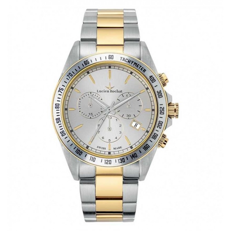 ShippingMontre homme Lucien Rochat R0473605001 Collection Reims. chronographe avec mouvement MVT. RONDA 5040.D CHR.DAT.H4 OB. avec fonction date. Le boîtier en acier poli et brossé. de forme ronde. Il mesure 42 mm et dispose d'un verre saphir. Cette montre est dotée d'un cadran soleillé argenté et d'un bracelet en acier. couleur or. avec boucle déployante. Résistant à l'eau jusqu'à 10 ATM.