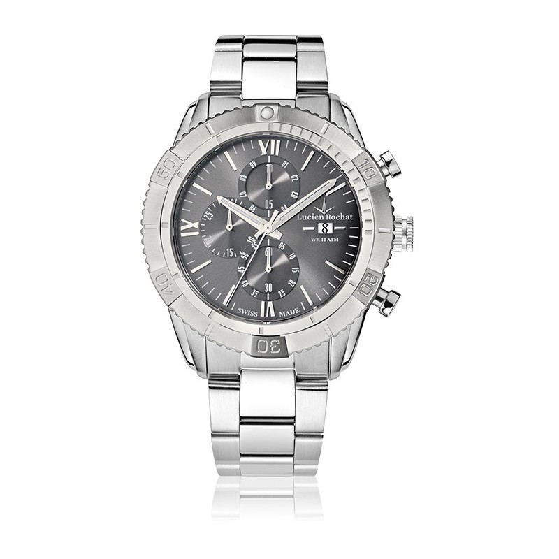 Montre chronographe Lucien Rochat pour homme de la collection Krab. Modèle avec boîtier poli et satiné de la taille de 52 x 45 mm et d'une épaisseur de 13,7 mm. Horloge avec cadran gris et bracelet en métal couleur acier et verre saphir. Modèle avec verre saphir, résistance à l'eau 10 Atm et mouvement MVT. Ronda 3540 6H / Aig.1 / Date 3H.