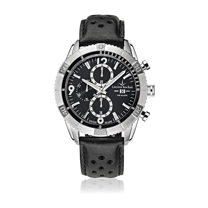 Montre chronographe Lucien Rochat pour homme de la collection Krab. Modèle avec boîtier poli et satiné de la taille de 52 x 45 mm et d'une épaisseur de 13,7 mm. Montre avec cadran noir soleillé et bracelet en cuir noir et boucle ardiglione. Modèle avec verre saphir, résistance à l'eau 10 Atm et mouvement MVT. Ronda 3540 6H / Aig.1 / Date 3H.