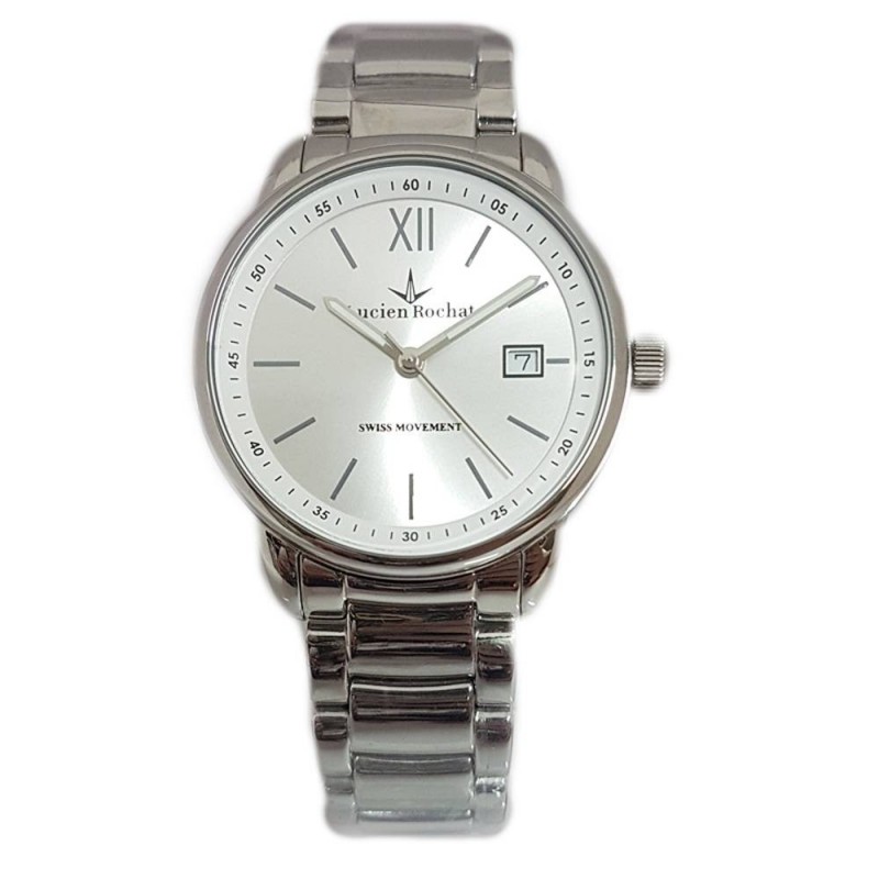 Montre pour homme Lucien Rochat de la collection Geste Gent avec boîtier en acier inoxydable argenté de 40 mm, cadran rond argenté avec fonction de date, marques de temps non numériques avec encoches, bracelet en acier inoxydable argenté, mouvement à quartz alimenté par une batterie résistante à l'eau de 10 ATM