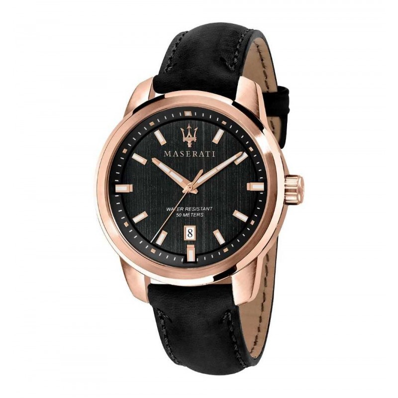 Boîtier en acier inoxydable plaqué or rose renfermant le cadran noir avec index bâton, logo Maserati et aiguilles en or rose avec guichet de date.