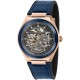 Montre pour homme Maserati R8821139002 avec mouvement mécanique automatique Seiko NH70 Skeleton, collection Maserati Triconic Watches. Ce modèle a un boîtier en acier pvd or rose de 40 mm. Le cadran est gris avec le mécanisme visible. Verre minéral avec traitement saphir. Couronne vissée. Fond en acier hublot avec verre et mécanisme apparent. Bracelet en cuir bleu avec boucle en acier et fermeture à ardillon La montre Maserati Ricordo est étanche à 100 mètres.