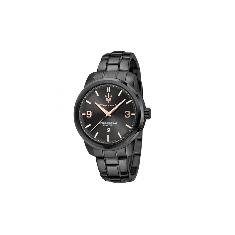 Montre-bracelet pour homme Maserati de la collection Successo avec mouvement à quartz 2115 et fonctions de temps uniquement avec date. Boîtier en acier inoxydable avec traitement IP gris foncé, finition polie et satinée, de 44 mm de diamètre et de 11,20 mm d'épaisseur, cadran analogique noir avec index bâtons et chiffres arabes, logo dans la partie supérieure et détails en or rose, affichage de la date à 6h , verre minéral. Bracelet en acier inoxydable gris foncé avec boucle déployante à bouton-poussoir. Résistant à l'eau 5 ATM : résistant aux éclaboussures d'eau mais pas sous pression.