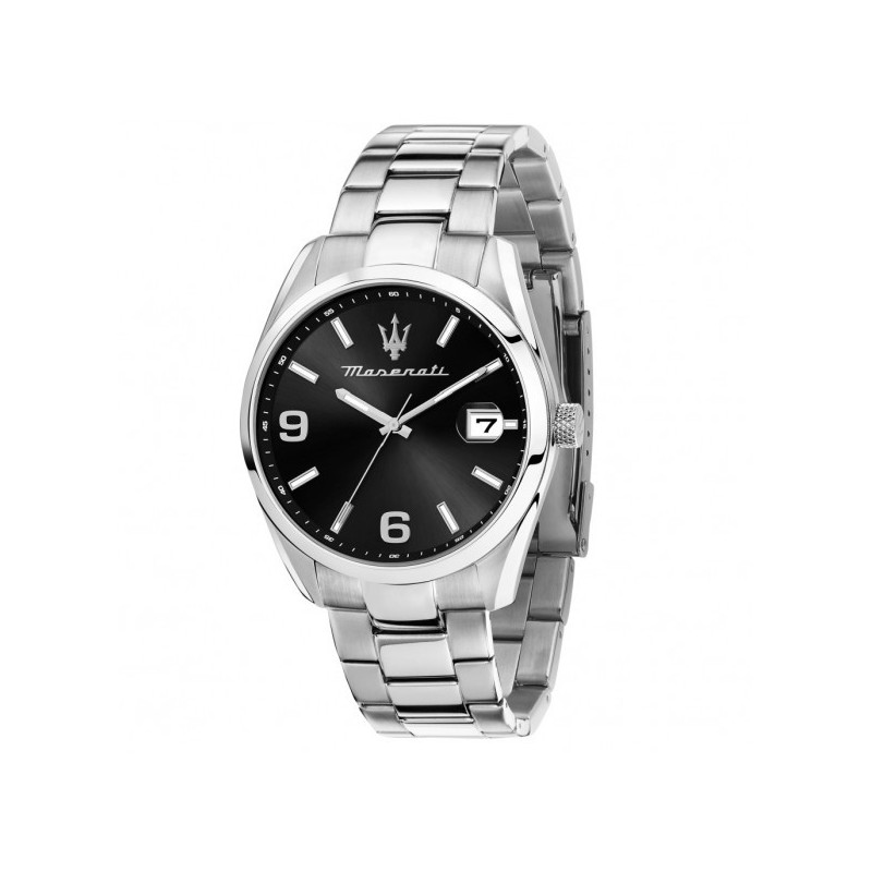 Montre-bracelet pour homme Maserati de la collection Attrazione avec mouvement à quartz Miyota 2415 et fonctions heure uniquement avec affichage de la date. Boîtier en acier inoxydable de couleur argentée finition polie mesurant 43 mm de diamètre et 10,75 mm d'épaisseur, cadran analogique noir avec index bâtons mixtes et chiffres arabes argentés, logo à 12h et affichage de la date à 3h avec loupe , verre minéral. Bracelet en acier inoxydable argenté avec fermeture à boucle de plongée à verrouillage de sécurité, résistant à l'eau 5 ATM : résistant aux éclaboussures d'eau mais pas sous pression.