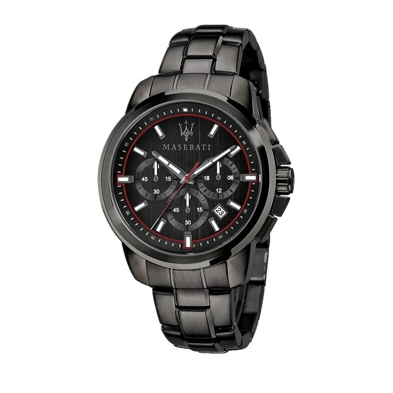Montre-bracelet pour homme Maserati de la collection Successo en édition limitée avec mouvement à quartz et fonction chronographe avec date. Boitier en acier inoxydable avec traitement PVD noir finition polie et satinée d'un diamètre de 44 mm et d'une épaisseur de 11,2 mm, cadran analogique noir avec détails rouges, index bâtons, logo à 12h, guichet de date entre 4 et 5h. horloge, verre minéral. Bracelet en acier inoxydable avec traitement PVD noir, finition brillante et satinée avec boucle déployante à boutons, étanche 5 ATM : résiste aux projections d'eau mais pas sous pression.