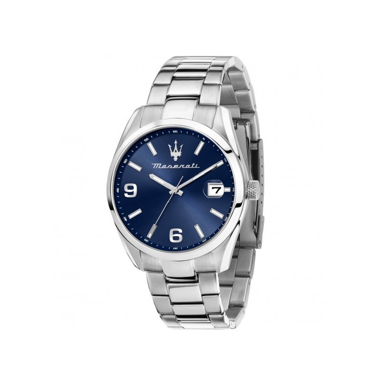 Montre-bracelet pour homme Maserati de la collection Attrazione avec mouvement à quartz Miyota 2415 et fonctions heure uniquement avec date. Boîtier de forme ronde en acier inoxydable argenté d'un diamètre de 43 mm, cadran analogique bleu avec index bâtons et chiffres arabes, logo à 12h et affichage de la date à 3h avec loupe. Bracelet en acier inoxydable argenté avec boucle déployante à bouton-poussoir, résistant à l'eau 5 ATM : résistant aux éclaboussures mais pas sous pression.