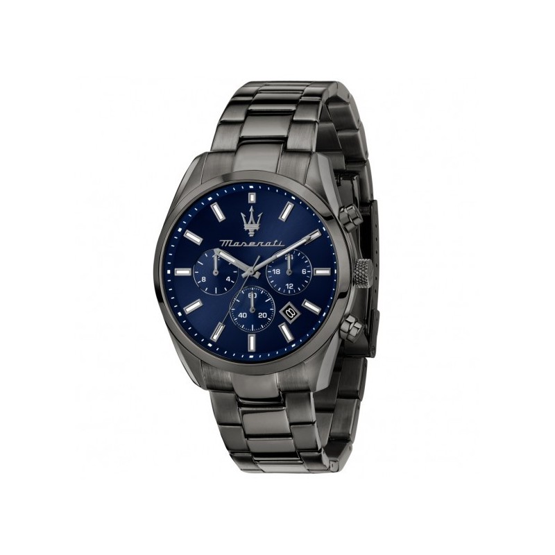 Montre-bracelet multifonction Maserati pour homme de la collection Attrazione avec mouvement à quartz VD33. Boîtier de forme ronde en acier inoxydable avec traitement gun metal IP d'un diamètre de 43 mm. Cadran analogique bleu avec index bâtons, logo à 12h et affichage de la date entre 4h et 5h. Bracelet en acier inoxydable argenté avec boucle déployante avec poussoirs, étanche 5 ATM : résistant aux éclaboussures mais pas sous pression.