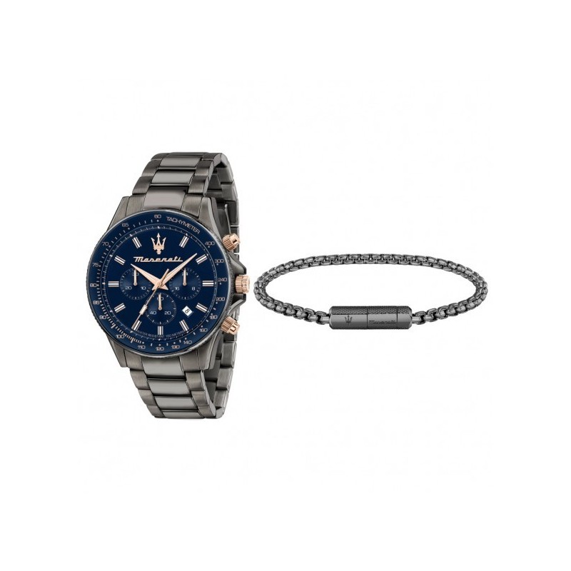 Montre-bracelet pour homme Maserati de la collection Sfida, dotée d'un mouvement à quartz Miyota JS25 et d'une fonction chronographe avec date. Boîtier rond en acier inoxydable avec traitement IP canon de fusil, 44 mm de diamètre et 11,4 mm d'épaisseur. Cadran analogique bleu avec index bâtons dorés roses, logo à 12 heures et guichet de date entre 4 et 5 heures, verre minéral. Bracelet en acier inoxydable canon de fusil avec boucle déployante à bouton-poussoir, étanche à 10 ATM. Un bracelet en acier inoxydable noir avec boucle de sécurité est inclus dans le coffret spécial.