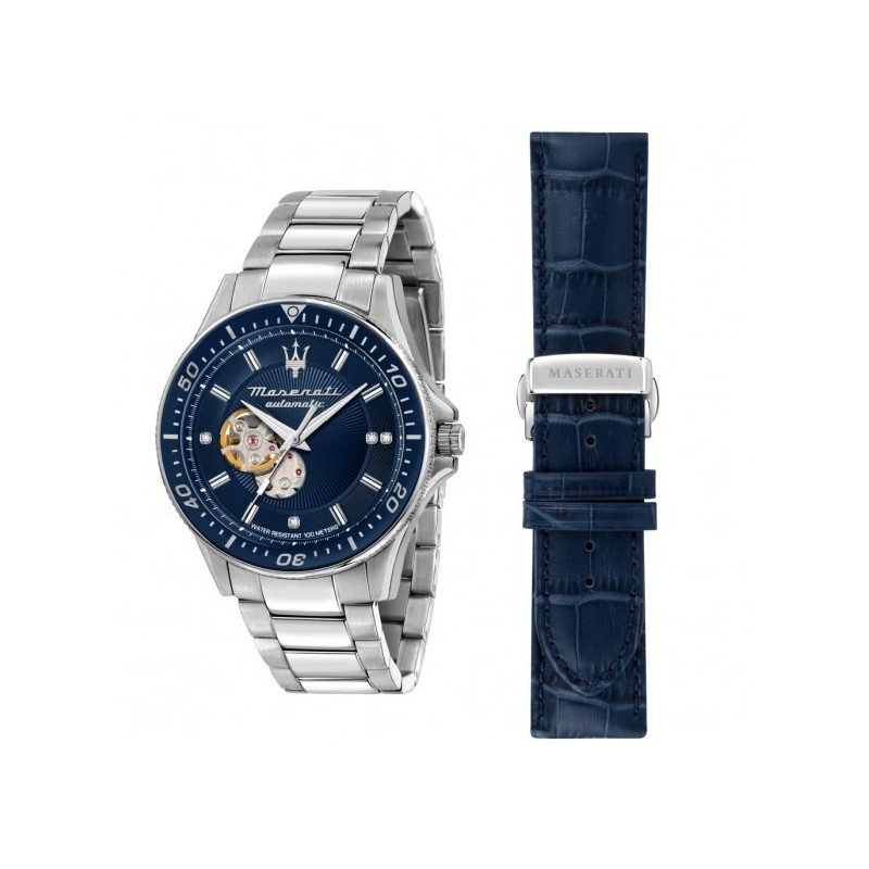Montre-bracelet pour homme Maserati de la collection Sfida, équipée d'un mouvement automatique SEIKO NH70 et d'un affichage de l'heure uniquement. Boîtier rond en acier inoxydable argenté de 44 mm de diamètre et 13 mm d'épaisseur, lunette et minuterie avec revêtement IP bleu. Cadran analogique bleu avec mouvement apparent, index bâtons et logo à 12 heures, verre saphir. Bracelet en acier inoxydable argenté avec boucle déployante à bouton-poussoir, étanche à 10 ATM. Un second bracelet en cuir bleu façon crocodile avec boucle ardillon est inclus dans le coffret cadeau.