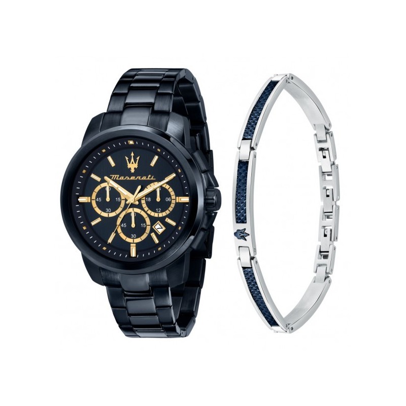 Montre-bracelet pour homme Maserati de la collection Successo, dotée d'un mouvement à quartz TMI VD25 et de fonctions chronographe avec date. Boîtier rond en acier inoxydable avec revêtement IP bleu, 44 mm de diamètre et 11,20 mm d'épaisseur. Cadran analogique bleu avec index bâtons dorés, logo à 12 heures, guichet de date entre 4 et 5 heures, verre minéral. Fond et couronne vissés pour une étanchéité renforcée. Bracelet en acier inoxydable avec revêtement IP bleu et boucle déployante à bouton-poussoir, étanche à 5 ATM : résiste aux éclaboussures, mais pas à la pression. Le bracelet est livré dans un coffret spécial.