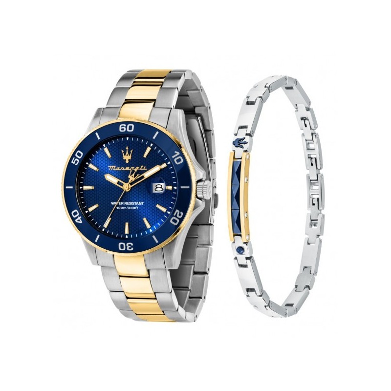 Montre-bracelet pour homme Maserati de la collection Competizione, dotée d'un mouvement à quartz Miyota 2315 et affichant l'heure et la date. Boîtier rond en acier inoxydable argenté de 43 mm de diamètre et 11,20 mm d'épaisseur, lunette dorée avec insert en céramique bleue et minuterie. Cadran analogique bleu avec index bâtons, logo à 12 heures, guichet de date à 3 heures, verre minéral. Bracelet bicolore en acier inoxydable argenté et doré avec boucle déployante à bouton-poussoir, étanche à 10 ATM. Un bracelet en acier inoxydable avec un maillon central doré orné de céramique bleue est inclus dans le coffret spécial.