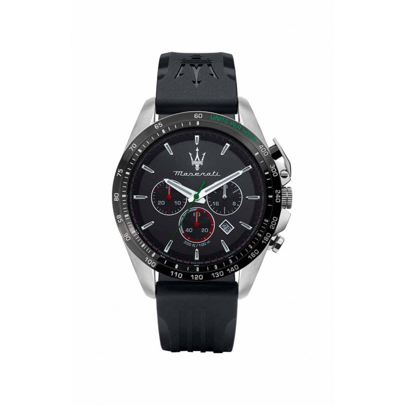 Montre homme Maserati de la collection Traguardo, dotée d'un mouvement à quartz multifonction et d'un double bracelet. Boîtier rond en acier inoxydable argenté de 45 mm de diamètre. Cadran analogique noir avec index bâtons, guichet de date entre 4 et 5 heures, logo en haut, verre saphir inrayable. Bracelet en acier inoxydable argenté avec boucle déployante et bracelet supplémentaire en silicone noir avec boucle ardillon. Étanche jusqu'à 10 ATM.