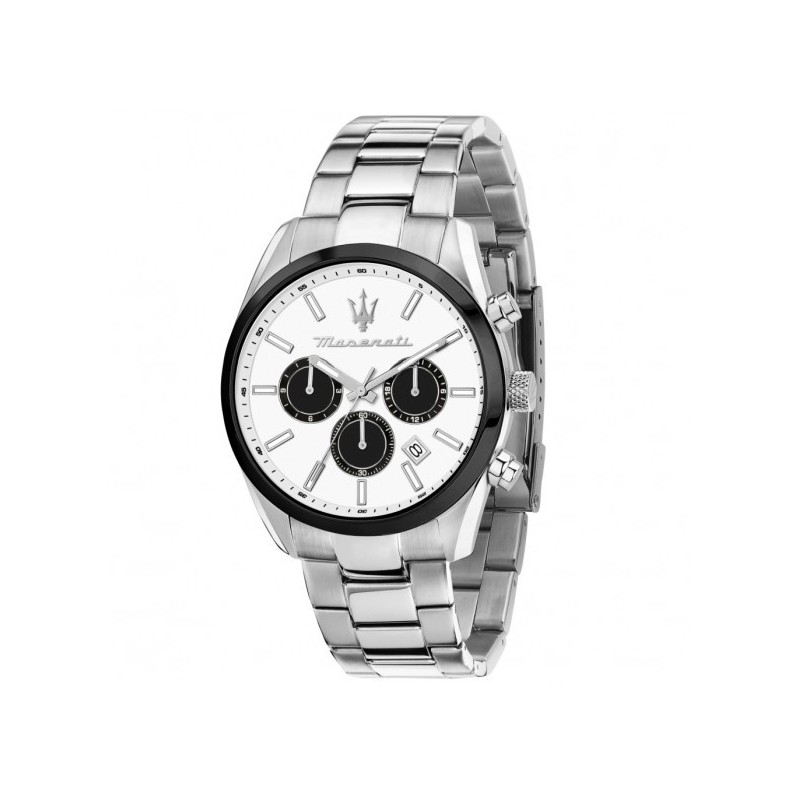 Montre-bracelet pour homme Maserati de la collection Attrazione, dotée d'un mouvement à quartz VD33 et d'une fonction chronographe avec date. Boîtier rond en acier inoxydable argenté, 43 mm de diamètre et 10,50 mm d'épaisseur. Lunette noire. Cadran analogique blanc avec compteurs noirs, logo à 12 heures et guichet de date entre 4 et 5 heures. Bracelet en acier inoxydable argenté avec boucle déployante de plongée et fermoir de sécurité. Étanche à 5 ATM : résiste aux éclaboussures, mais n'est pas étanche à la pression.