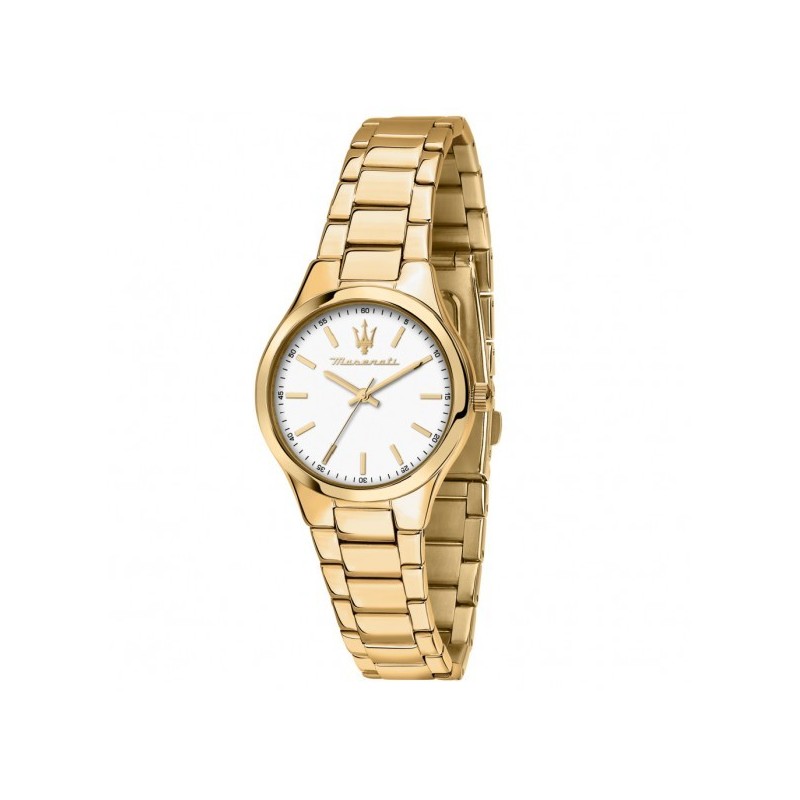 Montre-bracelet Maserati pour femme, collection Attrazione, mouvement quartz Miyota 2015, affichage de l'heure uniquement. Boîtier rond en acier inoxydable doré, 30 mm de diamètre et 8,05 mm d'épaisseur. Cadran analogique blanc avec index bâtons dorés et logo à 12 heures, verre minéral. Bracelet en acier inoxydable plaqué or avec boucle déployante à bouton-poussoir. Étanchéité 5 ATM : résistante aux éclaboussures, mais non étanche à la pression.
